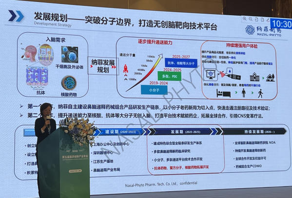 會上劉靜怡博士介紹,鼻腦遞釋技術的核心優勢,在于(一)顛覆性的遞送路徑:將直接繞過血腦屏障(BBB)、高靶向進入腦內發揮作用;(二)顯著的臨床效益——快速起效、降低外周副作用以及無創且依從性高;(三)針對常規途徑難以入腦的大分子,例如核酸、抗體藥物、神經干細胞等,該技術路徑可實現無創腦靶向遞送,為CNS疾病治療開啟新的時代。目前納菲已實現一系列突破性進展,首款抗腦血管意外代表性管線NPRD003已成功獲批FDA IND(Type 1 Drug-Device Combination),即將進入臨床階段;針對中樞病理性疼痛、精神分裂、阿爾茲海默癥等一系列CNS適應癥,持續開發多條小分子、大分子管線;并且基于特色技術平臺,正開展廣泛的行業交流與合作。